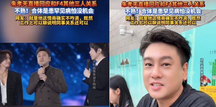 这场风波的起因,或许要从朱孝天在直播中的坦诚说起。在合体演出结束后不久,他就在『直播间』里坦言与其他三位成员“不熟”,甚至透露已经九年没有联系,连联系方式都没有。这些实话,瞬间打破了粉丝们对F4友情的想象。