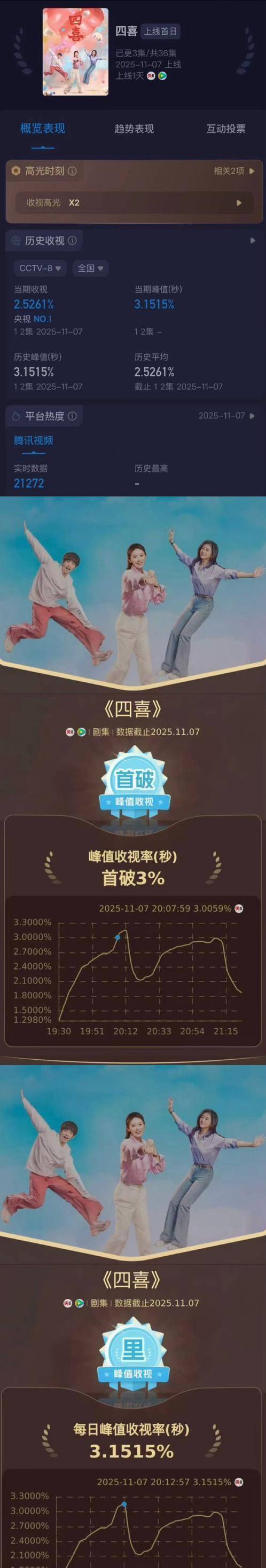 但更让人没想到的是,《四喜》一开播,收视率就迅速冲高,三十七分钟就破了3。它刷新了央八今年的首播纪录,网络播放量也很可观,豆瓣开分也不低。