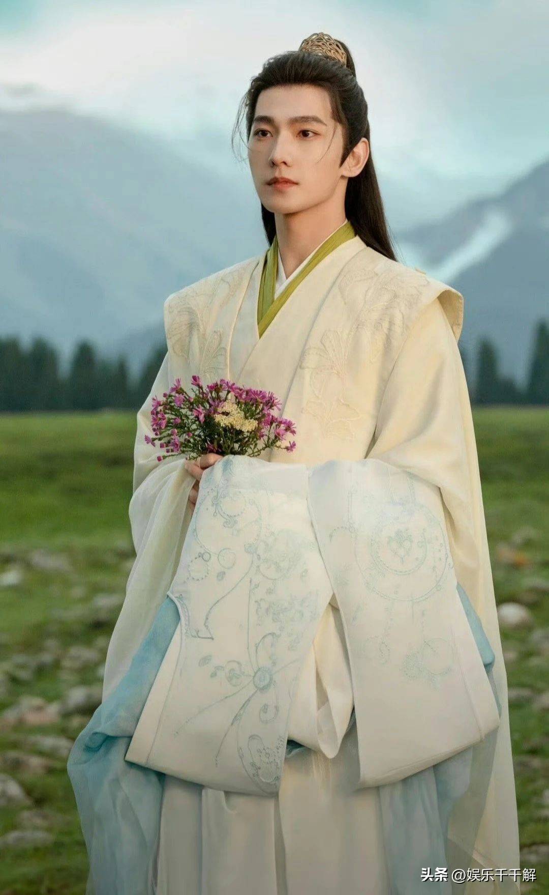 海报上的他身着白色戏服,简单的束发造型,手拿一捧仙花,气质仙气飘飘,眼神略带悲情地望向远处,感觉眼中的情绪多了很多。