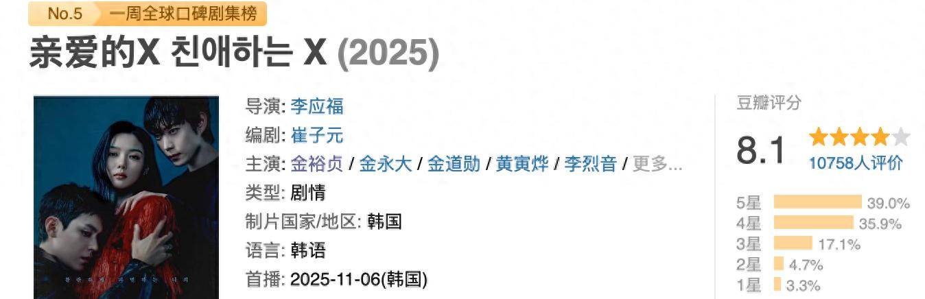 韩剧圈最近迎来一部意外爆火的作品,名为亲爱的X。刚上线不久便迅速占领全球热度榜单,在HBO Max多个地区登顶,仅凭前六集就在豆瓣拿下八点一的高分。它看似是一部『娱乐圈』️爽剧,实则讲述了一位从深渊中挣扎而出的女子如何一步步蜕变成令人畏惧的美艳恶女。