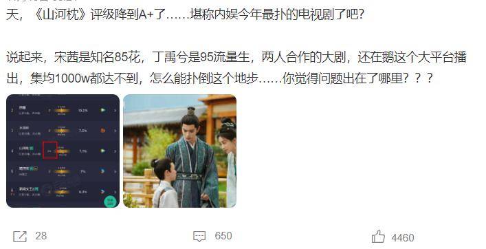 因此,有些网友开始反思,《山河枕》是否真的是今年最失败的古装剧?虽然它并未达到预期的热度,但与一些完全没有关注度的剧集相比,它并不算最差。事实上,许多古装剧上映后根本没有引起热议,而《山河枕》至少还有一定的讨论度。