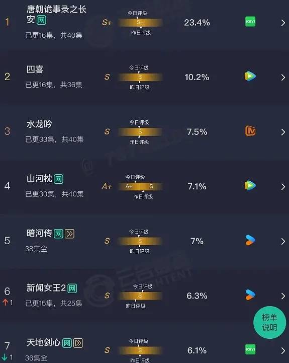 正因如此,《山河枕》的热度进一步下降,许多细心的网友发现,这部剧在云合数据的评分从S级降到了A级,这在剧集评分中极为少见。最终,《山河枕》以25000的热度和5.3的豆瓣评分画上了句号。