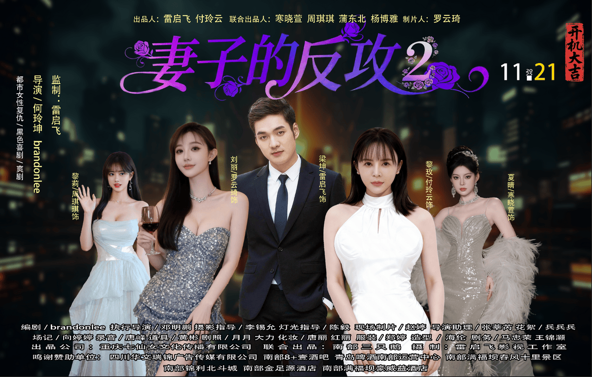 2025年11月21日,由重庆七仙女文化传播有限公司、四川南部文化旅游发展有限公司联合投资出品,由雷启飞、罗云琦(香港小紫藤)、付玲云、寒晓萱、周琪琪领衔主演,雷启飞影视工作室独家摄制的20集都市微短剧《妻子的反攻2》,在望月村龙锦别院隆重举行开机仪式。