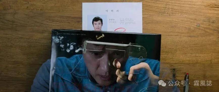 例如下面先后两次出现手枪与犯人的重叠,男主计划杀人,他将三个目标的简历放在手枪盒子里,自己的简历压在盒子下,手枪与他的脸重叠。目标、动机、凶器、犯人,都浓缩在一个画面中交代完毕。