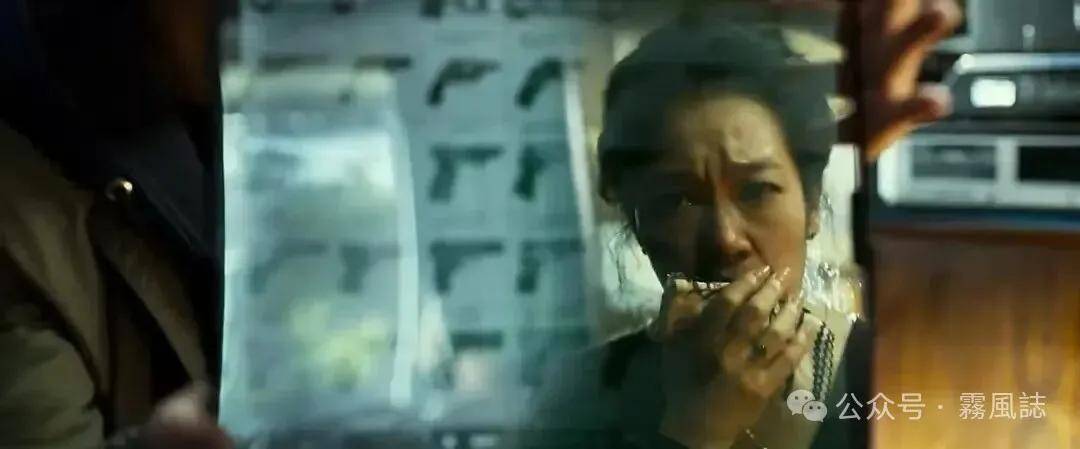 具范模妻子在面对警察询问、指认手枪型号的场面,她的脸与电脑屏幕上的枪重叠,明明就是她开枪的,犯人亲自指认作案凶器的讽刺感拉满,不愧是演员人设。