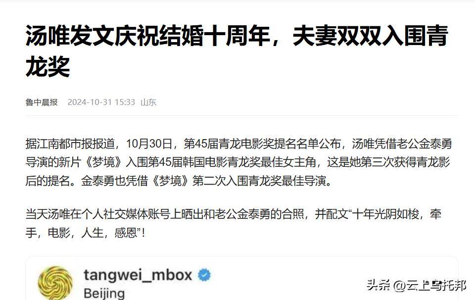 2025年10月30日,『汤唯』在『社交媒体』上发文庆祝结婚十周年,并晒出了与丈夫的合影。