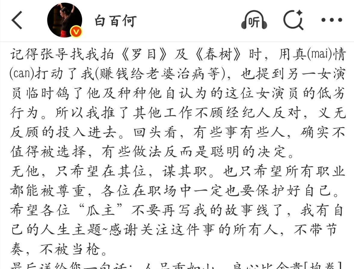 至于『白百何』,她在11月6日下午发了长文,解释自己提前离开的原因。她说是因为接到制片方通知,知道自己没有获奖,所以提前回国了。她还把矛头指向了导演和『制片人』。