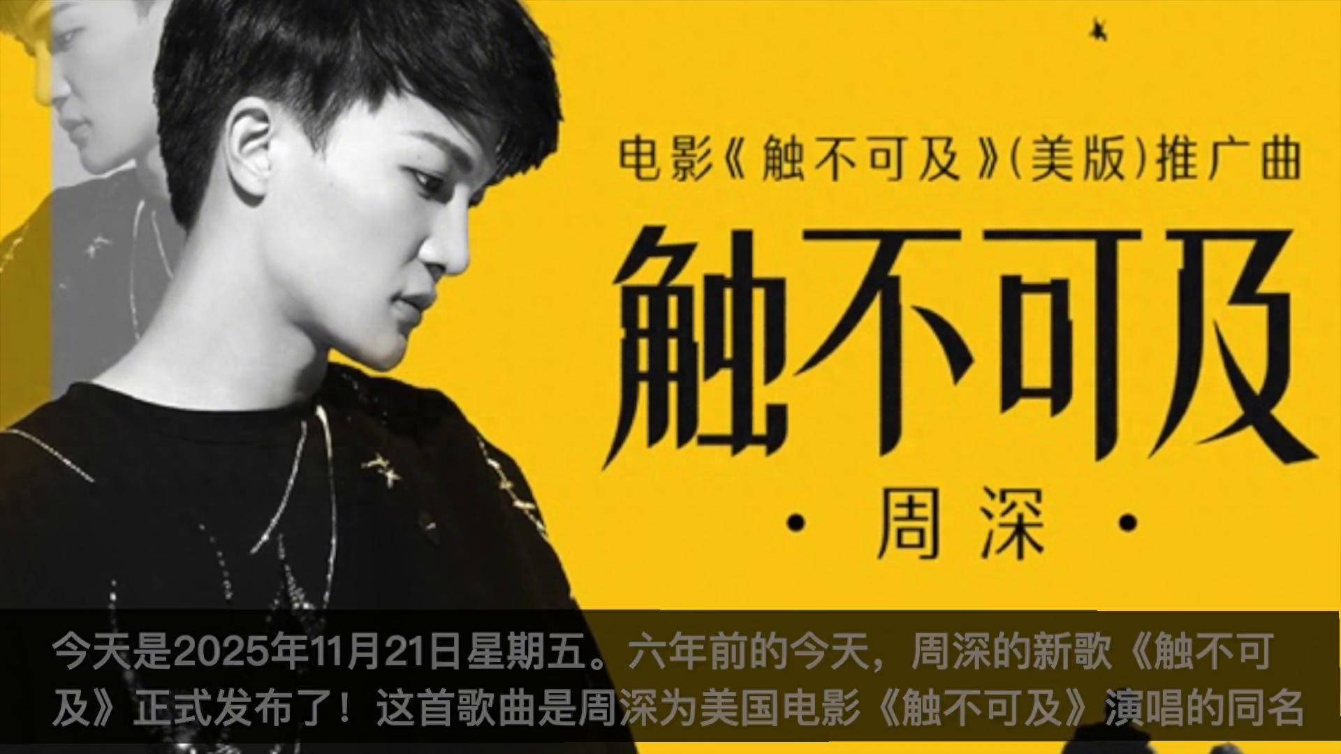 2025年11月21日,星期五,今天恰好是『周深』新歌《触不可及》发布六周年的纪念日。这首为美国电影《触不可及》演唱的同名推广曲,自上线以来便收获了大量关注,成为『周深』在QQ音乐上收藏量突破百万的热门作品之一。值得一提的是,这首歌曲还在2020腾讯音乐娱乐盛典上斩获了十大金曲奖项,展现了其极高的艺术价值和影响力。