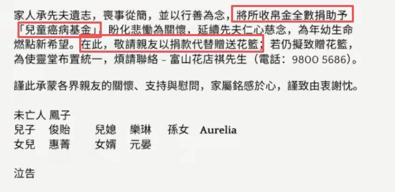 比较特别的是,讣告中有一句:“请亲友以捐款代替花篮”。意思是不用送花,可以把心意折成捐款,而这些钱将全部捐给“儿童癌症基金”。