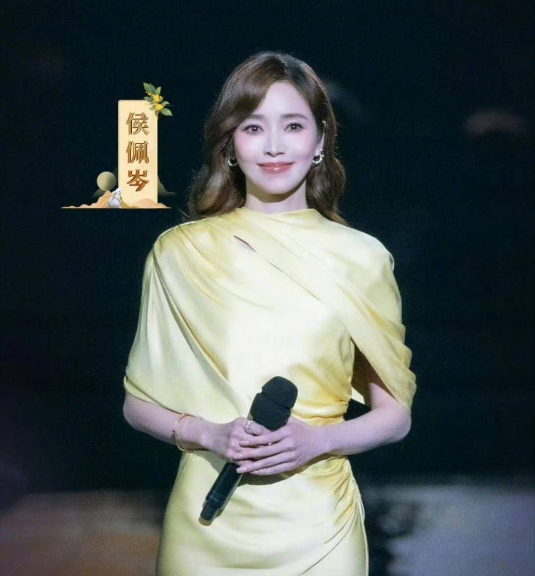 另一位主持人侯佩岑,是时隔十二年再次登上中秋晚会的舞台。她穿着一身黄色长裙👗,发型优雅,说话温柔舒缓,很有亲和力。