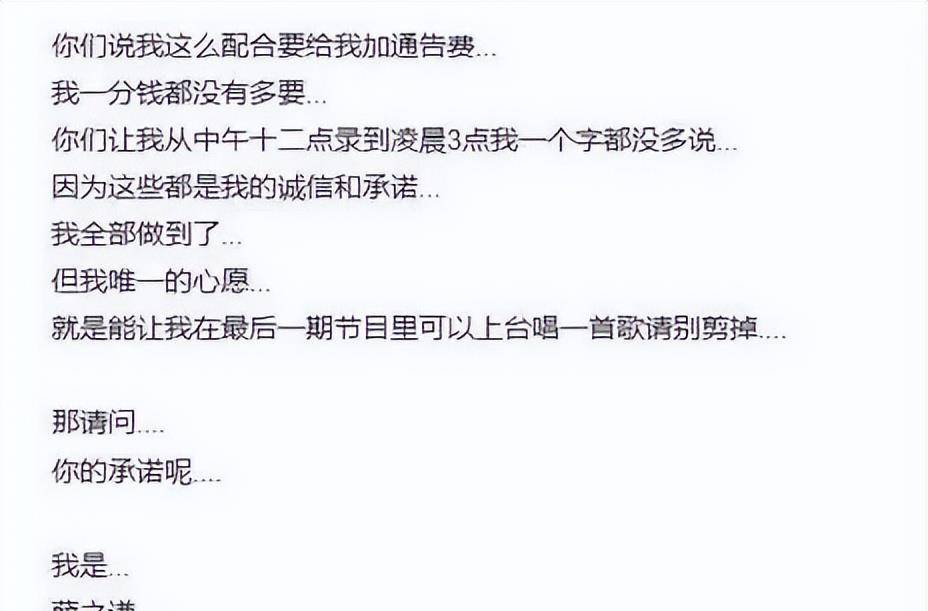 但在《谁是大歌神》节目里发生的一件事让他很失望。他全力配合节目效果,只希望在最后能完整唱一首歌,结果这段表演却被剪掉了。这件事让他更加坚定了要维护音乐人尊严的决心。
