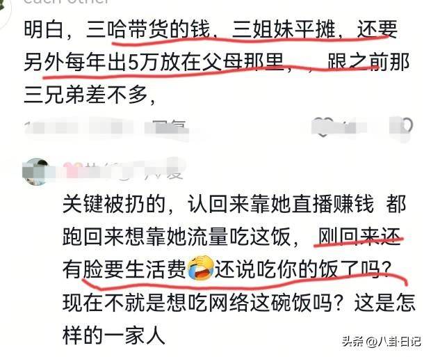 当时也有很多人认为这个生活费的事情哈爸哈妈应该是知道的,他们也同意的,觉得他们也需要三个女儿给他们出生活费的。