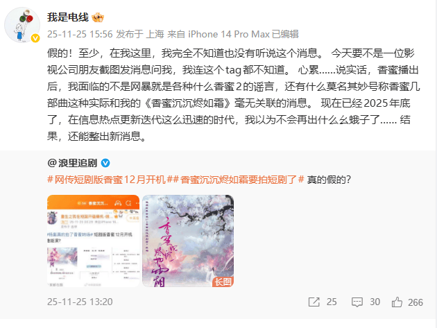 然而令人意外的是,就在11月25日,《香蜜沉沉烬如霜》的原著作者电线才辟谣过这一消息。25日,有自媒体博主爆料香蜜短剧版要在今年12月底开机了,已在『社交平台』消失了两年多的电线通过『社交平台』对此进行辟谣,似乎对此事完全的不知情:“假的!至少,在我这里,我完全不知道也没有听说这个消息。今天要不是一位影视公司朋友截图发消息问我,我连这个tag都不知道。”电线称:“香蜜播出后,我面临的不是网暴就是各种什么香蜜2的谣言,还有什么莫名其妙号称香蜜几部曲这种实际和我的《香蜜沉沉烬如霜》毫无关联的消息。 现在已经2025年底了,在信息热点更新迭代这么迅速的时代,我以为不会再出什么幺蛾子了…… 结果,还能整出新消息。”没想到此次的网传消息是真的,电线对此没有做出回应。