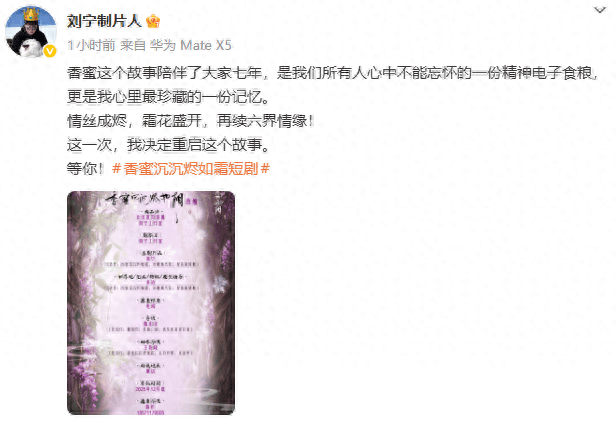 11月26日下午,《香蜜沉沉烬如霜》『制片人』刘宁正式官宣将重新制作短剧版《香蜜沉沉烬如霜》,“香蜜这个故事陪伴了大家七年,是我们所有人心中不能忘怀的一份精神电子食粮,更是我心里最珍藏的一份记忆。情丝成烬,霜花盛开,再续六界情缘!这一次,我决定重启这个故事。”电视剧《香蜜沉沉烬如霜》的官方微博也发布了这一条信息,并发布了一条概念短片,配文“有只魇兽来提醒你,香蜜系统准备重启啦!全新演绎六界虐恋传奇,准备开团,各位道友快跟上。”