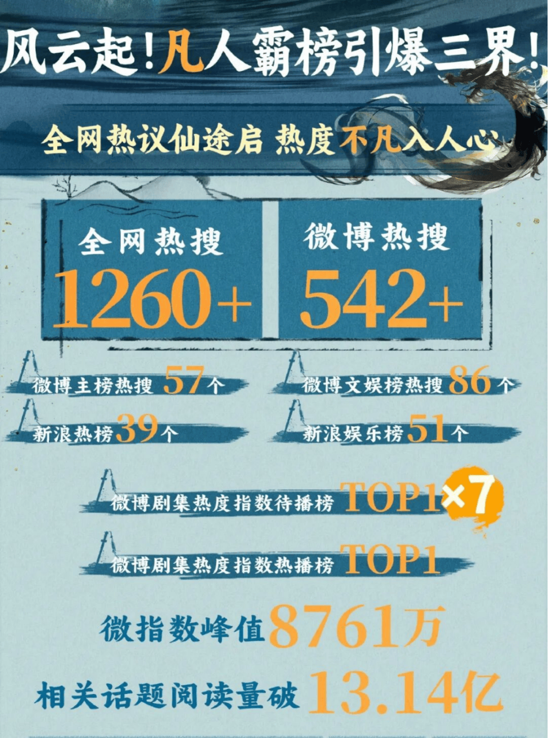 剧集播出后收获斐然成绩。《凡人修仙传》开播⾸⽇热度达8326,创下『优酷』2024年以来开播⾸⽇热度最⾼纪录;播出第三天热度值即破万。