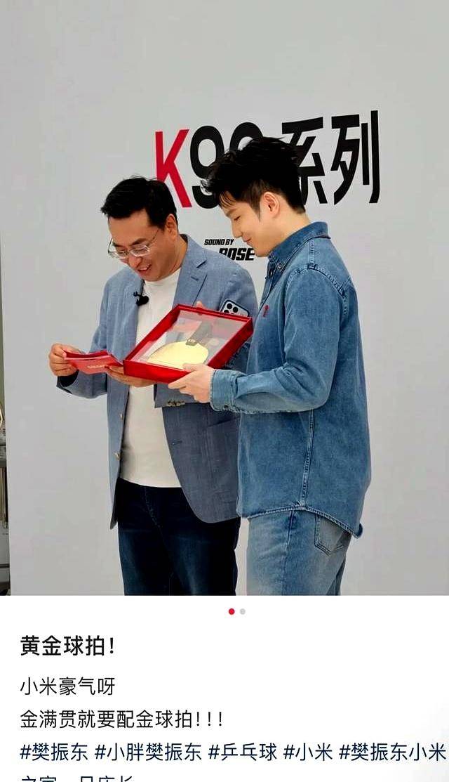 活动现场的高潮来得猝不及防。当雷军捧出那把金光闪闪的定制球拍时,全场都惊了。400克纯金打造,价值40万,这礼物🎁壕得简直不像话。但雷军送得很有讲究——不是随便送块金砖,而是专门做成乒乓球拍造型,既符合樊振东的职业身份,又暗含“金满贯”的吉祥寓意。