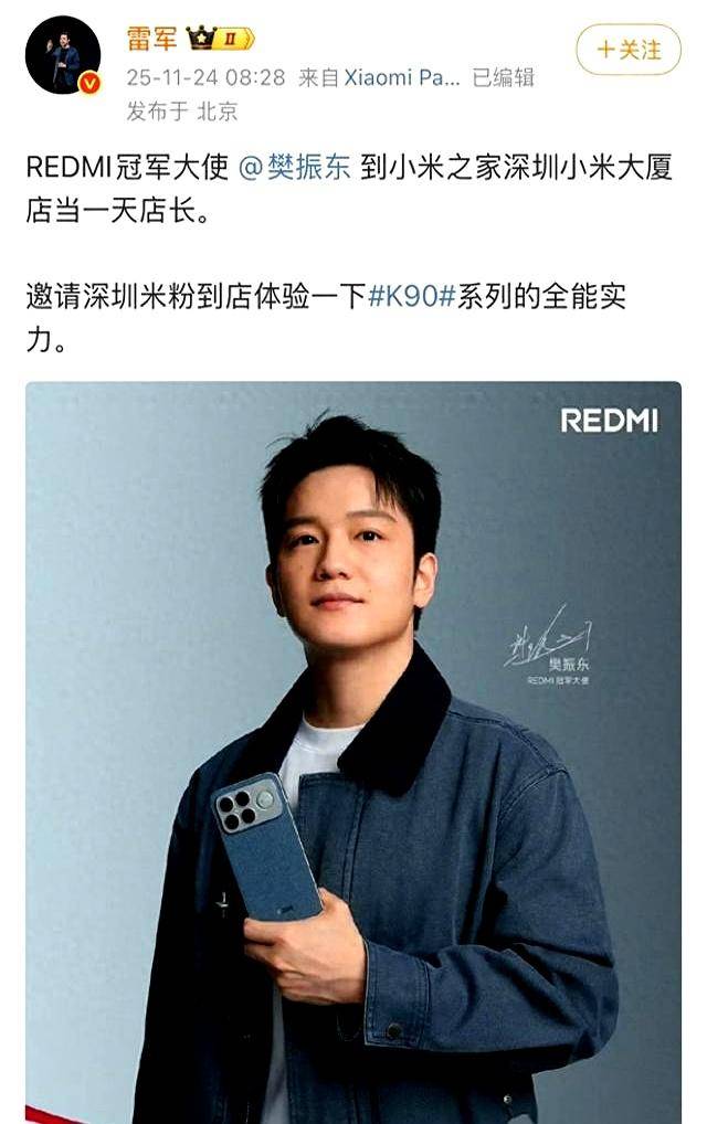 更绝的是,雷军这波送礼的时机拿捏得死死的——樊振东刚卫冕冠军,热度正高,小米立马官宣他当品牌大使,还安排他当“一日店长”。这一套组合拳下来,不仅赚足了眼球,还让小米和体育精神狠狠绑定。
