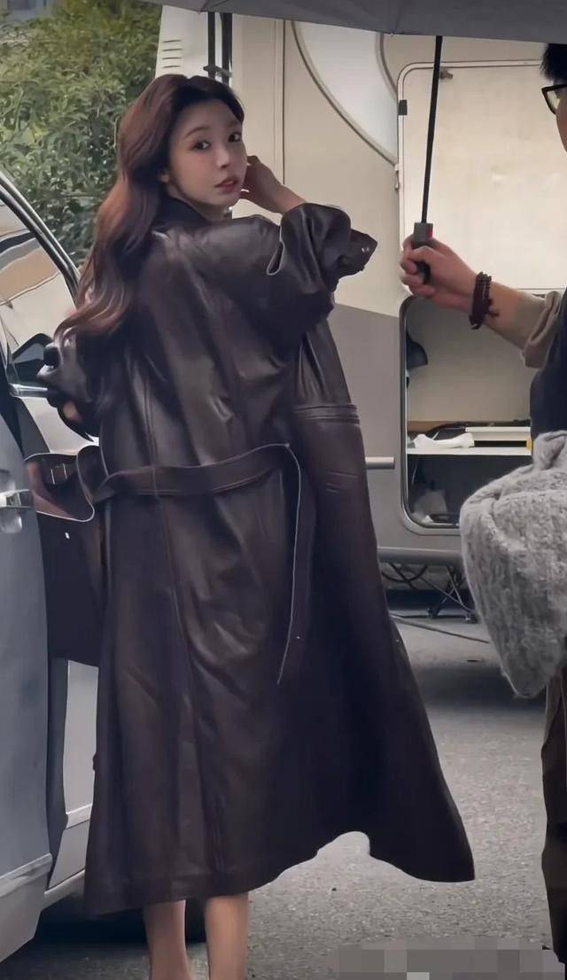 恋情公开后,易梦玲的商业价值直接坐上火箭,资源肉眼可见地升级。11月22日,也就是恋情曝光后的第二天,她就马不停蹄地开工,前往北京某高端摄影棚拍摄某国际知名皮具品牌的冬季广告,这也是她首次以"胡彦斌女友"身份公开亮相。路透照一出来就直接炸了热搜——#易梦玲皮衣造型#话题空降热搜前三,阅读量半天内就直逼五亿。照片里的她状态绝佳:身穿该品牌经典款黑色皮衣长外套🧥,衣摆垂到大腿中部,内搭黑色短款露腰上衣,下身搭配黑色皮质短裙和过膝长靴,110cm+的大长腿被衬托得淋漓尽致,腰间的腰带设计巧妙收腰,既凸显了纤细腰线,又拉长了身材比例,全黑造型酷飒十足,和她以往的甜美风格形成反差萌。网友们在评论区彻底沸腾,一半夸造型一半羡慕胡彦斌:"这腿长简直是上帝视角的馈赠""胡彦斌也太有福气了,能拥有这样又美又飒的女友""这造型直接把品牌调性拉满,品牌方选对人了",还有网友开玩笑说"恋情果然是最好的美容剂,这状态好到发光"。