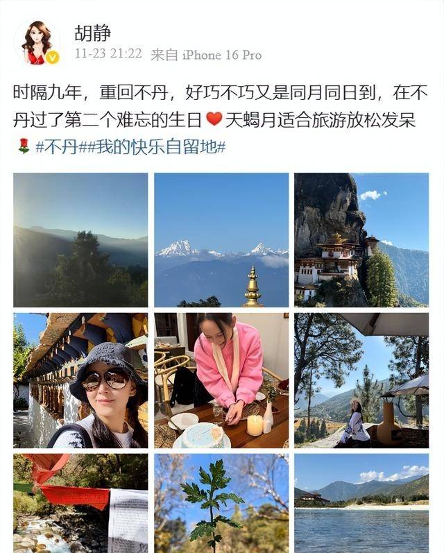 2025年11月23日,胡静在『社交平台』分享了47岁生日照片,她时隔九年重回不丹庆祝生日。她配文表示时隔九年重回不丹,又恰逢同月同日,因此在不丹度过了第二个难忘生日。照片中,她扎双马尾,戴墨镜🕶️,朱兆祥为她在不丹订制了生日蛋糕,并拍摄了她切蛋糕的照片。她在不丹的行程包括旅游和庆祝活动,朱兆祥陪伴她一同旅行。不丹作为旅游目的地,她九年前于2016年11月曾前往那里旅行,此次重回结合了生日庆祝。