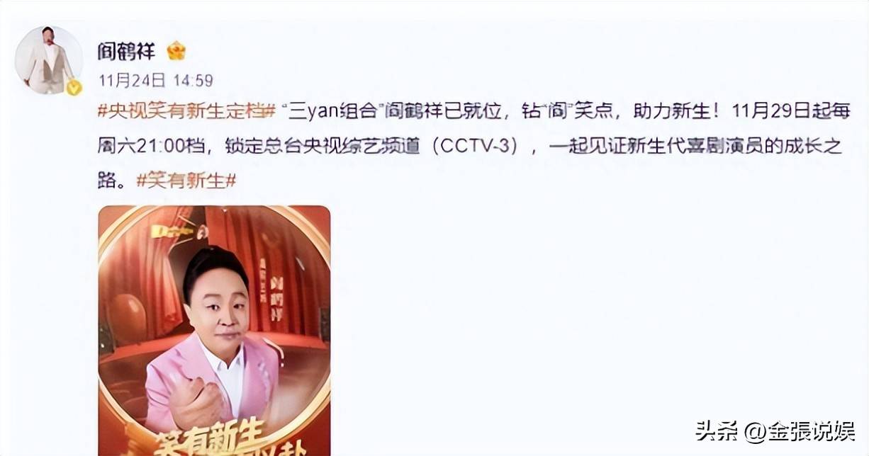 央视综艺频道《笑有新生》官宣阎鹤祥担任嘉宾主持,节目定在11月29日起每周六晚上9点播出。