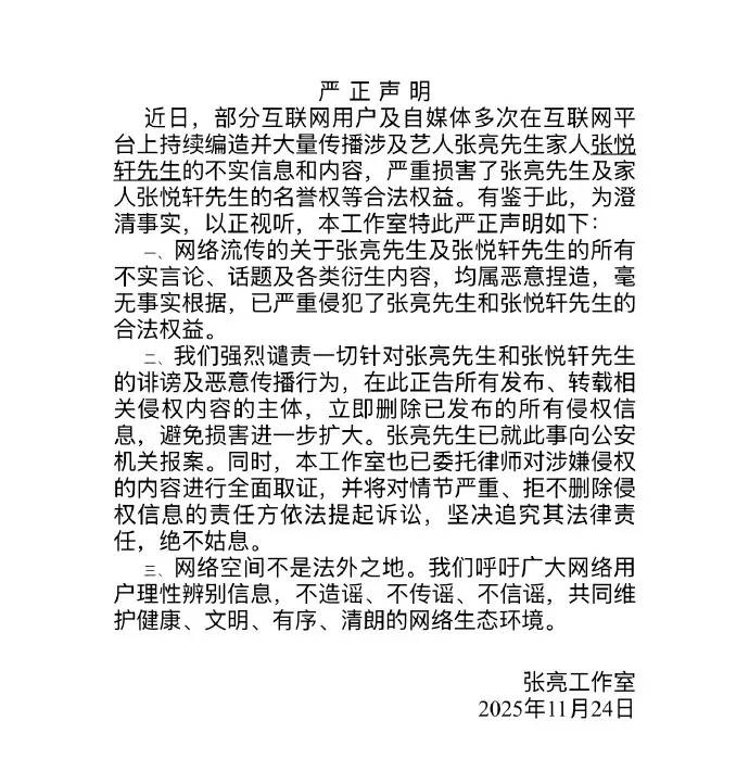 搜狐娱乐讯 日前,有网友爆料“麻辣烫奶爸的儿子老在国内闹事,所以被送到国外读书,结果把同学肚子搞大了”,有网友怀疑是张亮和其儿子天天。11月26日,张亮方发声明称这是不实言论并透露已经报案。
