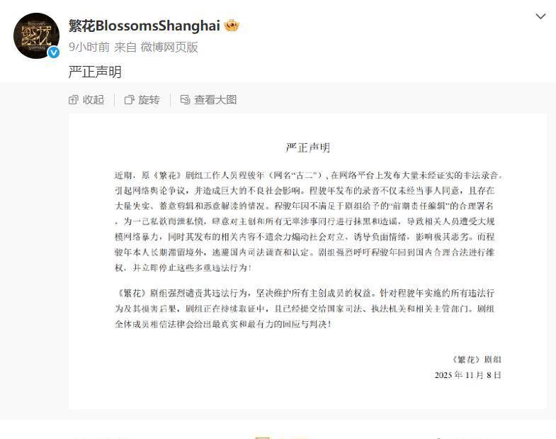 面对接二连三的实锤,《繁花》剧组仅发布声明指责恶意剪辑,呼吁身在国外的古二回国维权。这种回应显然难以服众,尤其是在第三波录音曝光后,剧组的沉默更显得欲盖弥彰。
