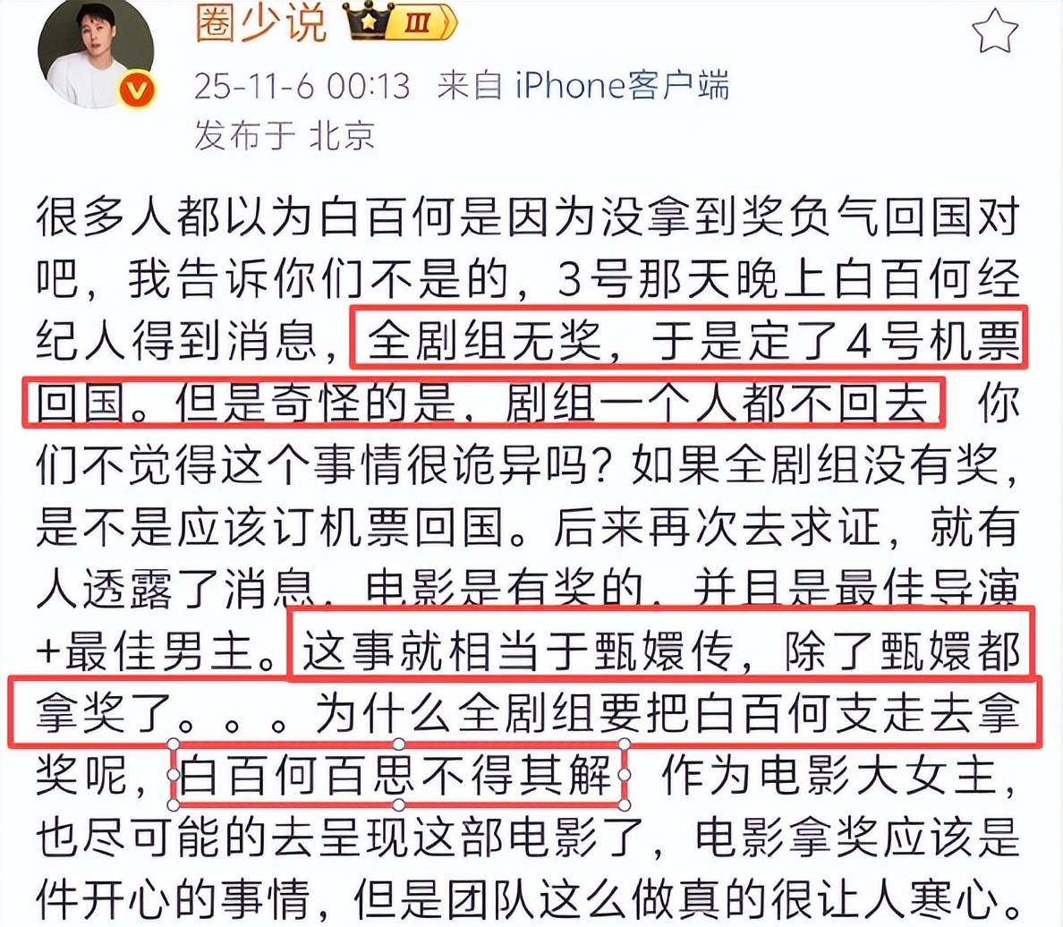 更劲爆的还在后面!据知情博主爆料,白百合的愤怒根本不是因为没得奖。3号晚她听说“全军覆没”,立刻定了4号机票回国。诡异的是,全剧组竟无人同行!结果飞机刚落地,就传来导演和男主双双获奖的消息……这操作,堪比《甄嬛传》里“全员领赏唯独瞒住主角🎭️”的宫斗大戏!