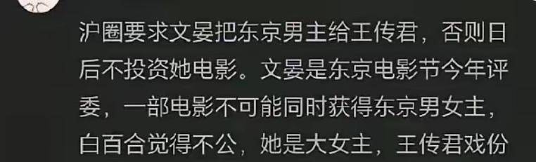 风暴中心直指同片女主角🎭️白百合。据传她因与奖项失之交臂,直接亲自上阵“开撕”!网络传言四起:有说沪圈资本暗中施压,硬是把影帝奖杯🏆️“塞”给了『王传君』;更有人直言,一部电影很难同时把男女主角🎭️奖都拿下,白百合成了“牺牲品”。