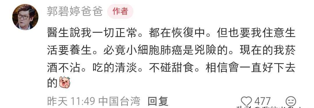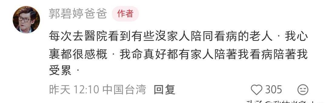 粉丝们劝郭爸爸别太在意外人的议论,女儿孝顺本来就是理所当然的事。郭碧婷自己有能力赚钱,花钱陪爸爸看病,完全说得过去,讲得通。