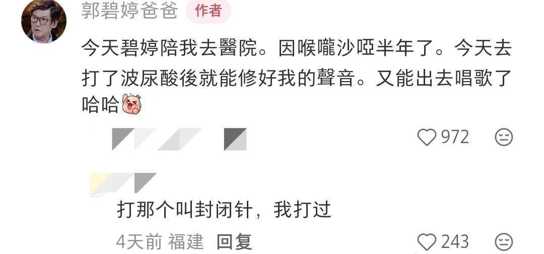 之前郭爸爸脖子上贴着纱布,是郭碧婷陪他去看嗓子啦。老爷子喉咙沙哑半年,女儿贴心陪着他打针修声音,笑着说又能出去唱歌了。看得出嗓子舒服了,心情也跟着变好不少。