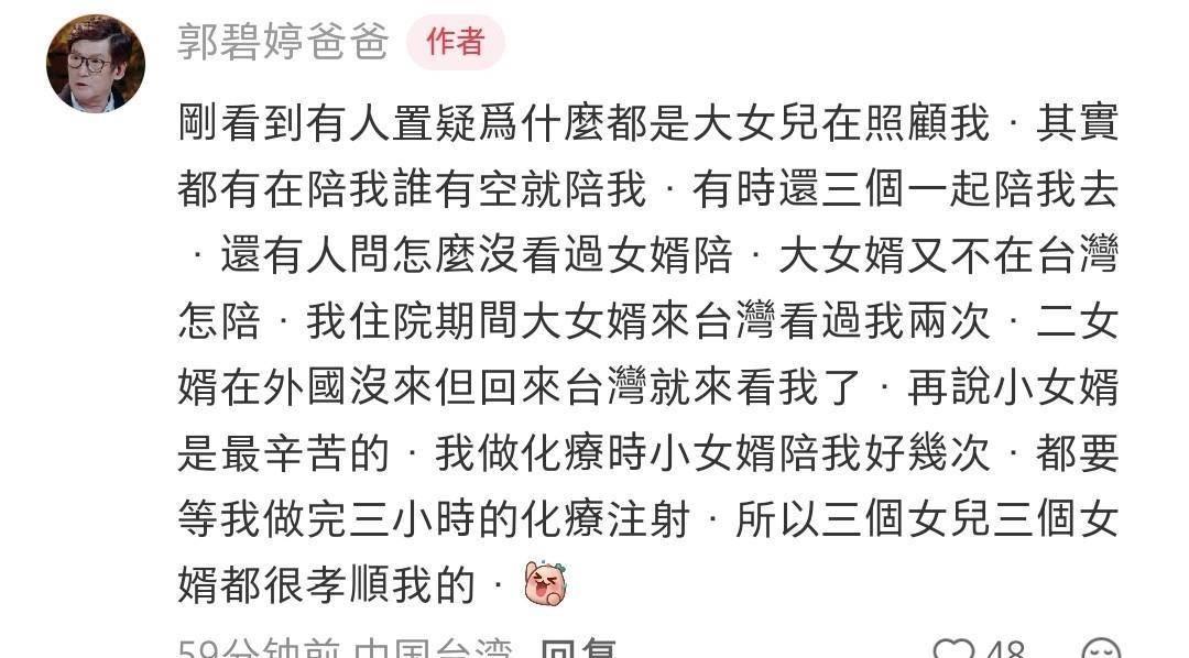 关于那三个女婿,大女婿向佐不在台北,没办法陪伴,但在住院期间曾经来探望过两次。二女婿在国外,回家的时候也会过来看望老人。至于三女婿,更是最辛苦的那一个,做化疗的时候都是他陪伴着,所以三个女婿都挺孝顺的,家里也没有什么全靠郭碧婷的情形。