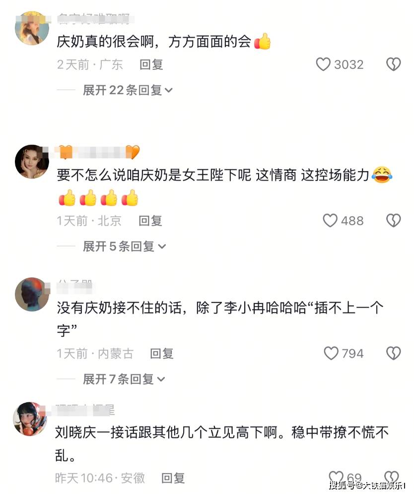 这期节目一播,网友纷纷对庆奶这个临场发挥赞爆了,有人说她说话很有艺术水平,顾及每一个人的情绪,又不会显得客套得虚假。