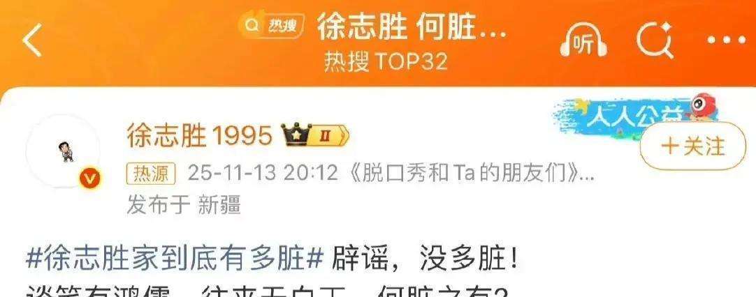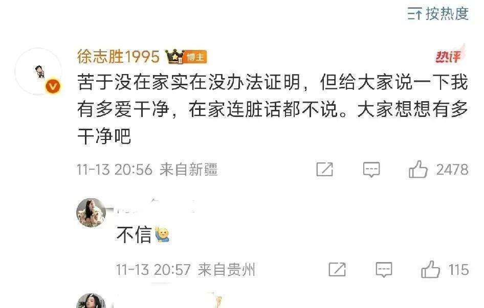 面对好友的调侃,徐志胜迅速在微博上回应,直言“没多脏!”,并引用了一句古文:“谈笑有鸿儒,往来无白丁,何脏之有?”随后,他在评论区补充道:“我在家连脏话都不说,大家想想有多干净!”整场互动,他没有生气,反而用幽默化解了尴尬,展现了他大度且通透的个性,这种从容不迫的态度也让他圈了不少粉。