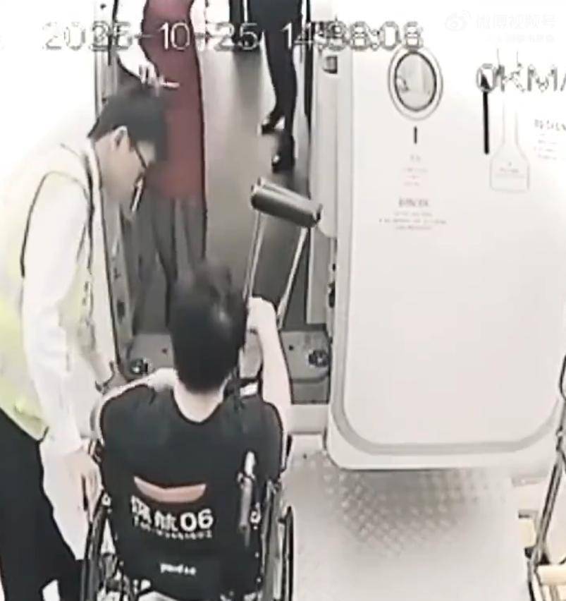 当机场公布监控录像,所有人目瞪口呆:哪有什么"连滚带爬"!画面清晰显示工作人员推着轮椅全程护送,耐心解释机舱高度差,最后三人合力将他平稳抬进客舱。