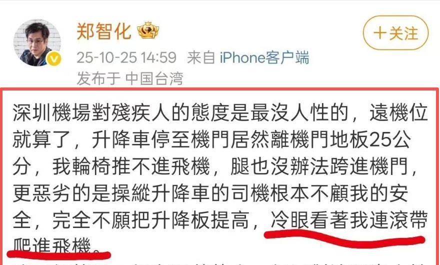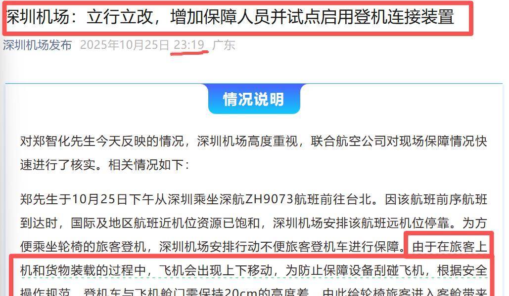 深圳机场火速回应,不仅致歉还立即整改。当晚发布长文说明,解释20厘米落差符合安全标准,并证实郑智化其实在工作人员帮助下顺利登机。
