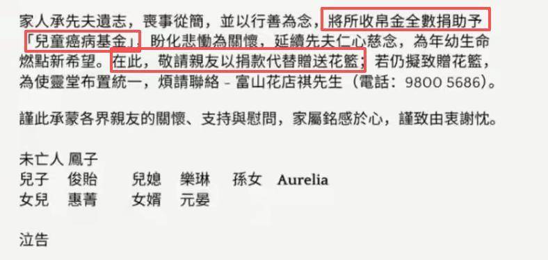 最令人动容的是讣告中的特别请求——“恳请亲友将购置花篮的款项捐作善款”。这意味着不收传统花圈,而是希望将这份心意转化为爱心捐赠。更暖心的是,所有善款将全数捐赠给“儿童癌症基金”。