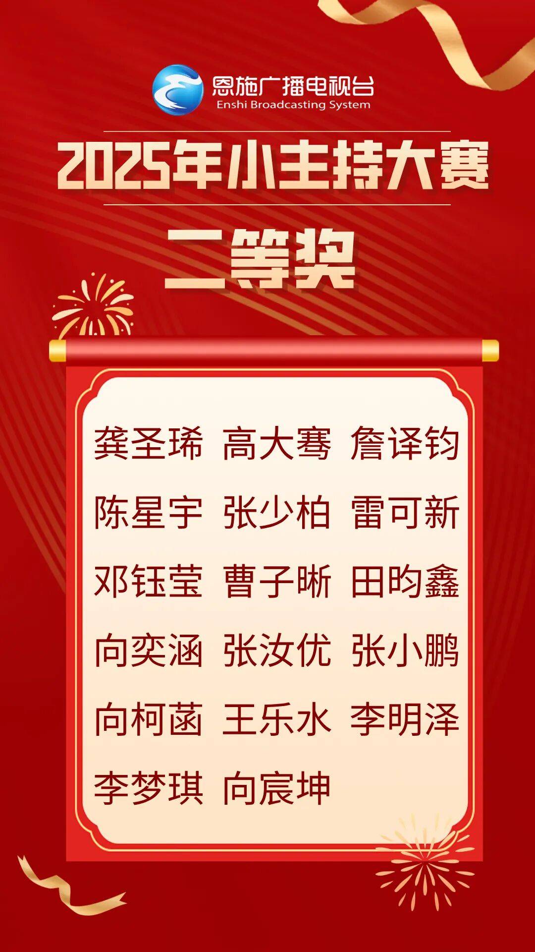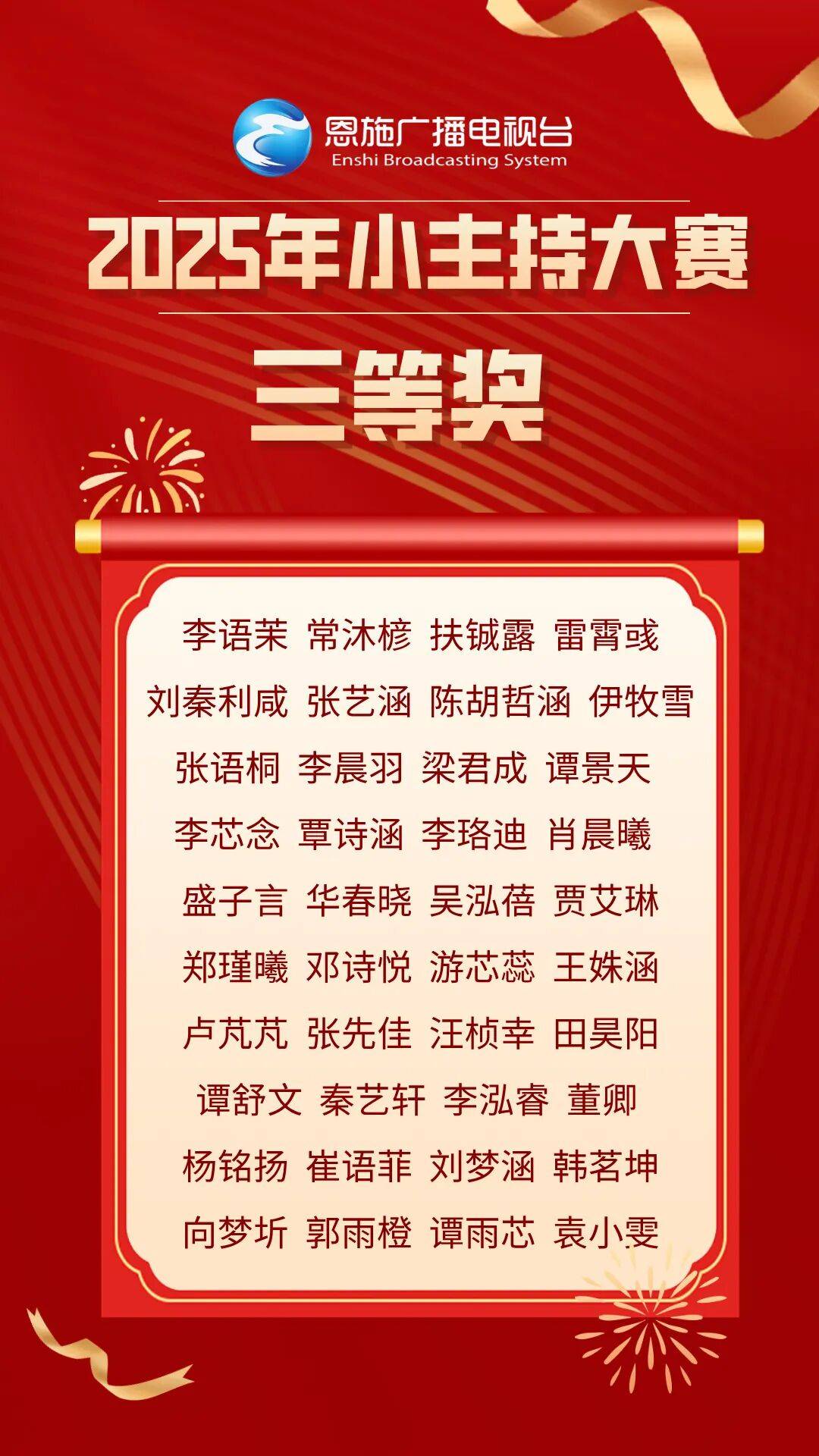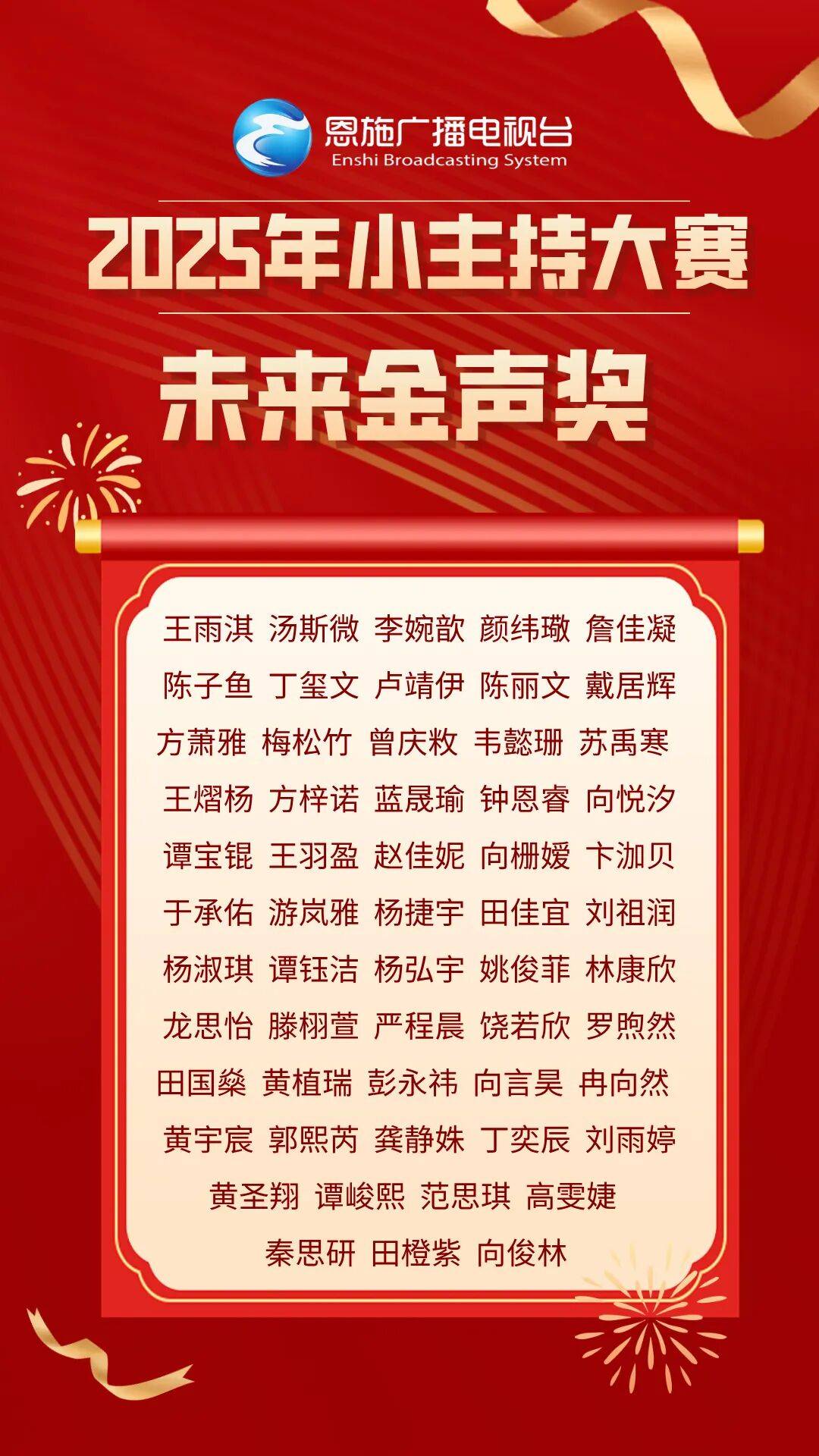 经过激烈角逐,最终60名选手凭借出色表现脱颖而出,分别斩获大赛一二三等奖。值得一提的是,这些获奖选手还将有机会登上恩施州广播电视台2026少儿春晚的舞台,届时将以更精彩的表现闪耀荧幕。