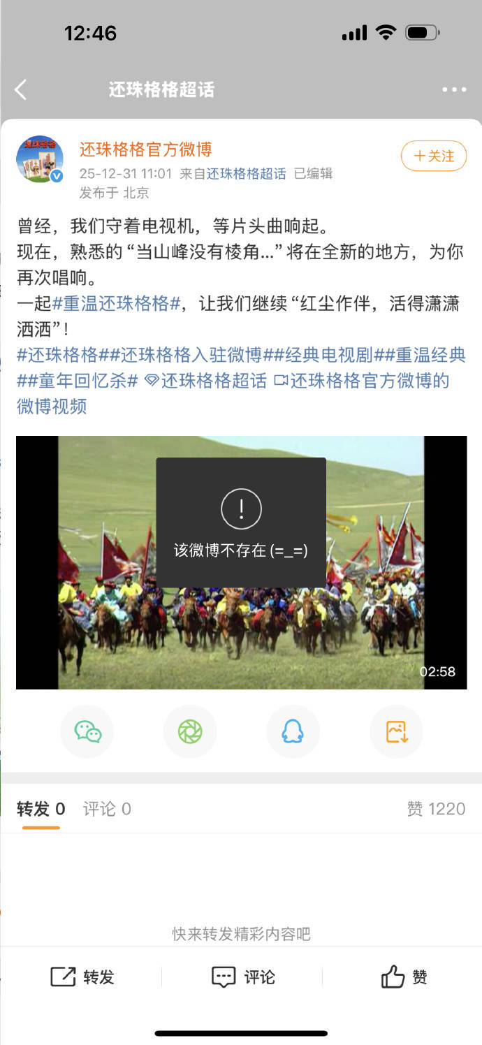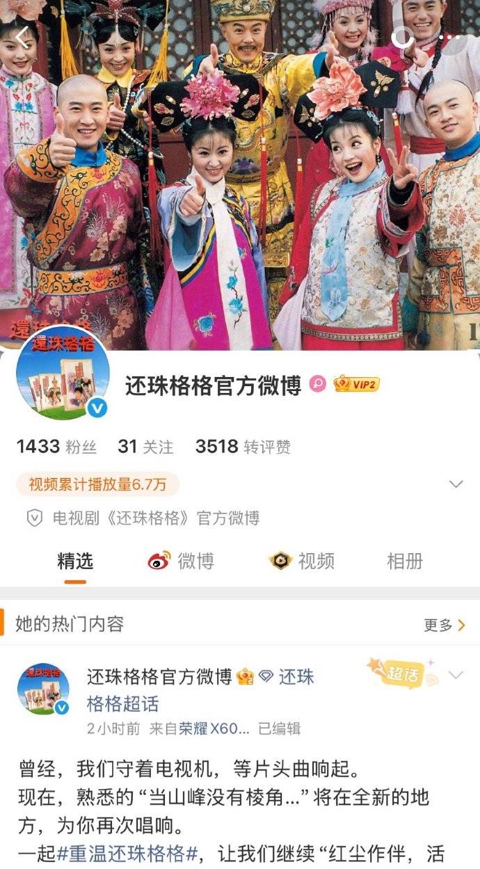 2025年12月31日,经典电视剧《还珠格格》官方微博正式开通,首条内容以主题曲《当》的歌词唤醒集体记忆,同步创建超话并关联琼瑶等核心账号,瞬间引爆全网怀旧热潮。