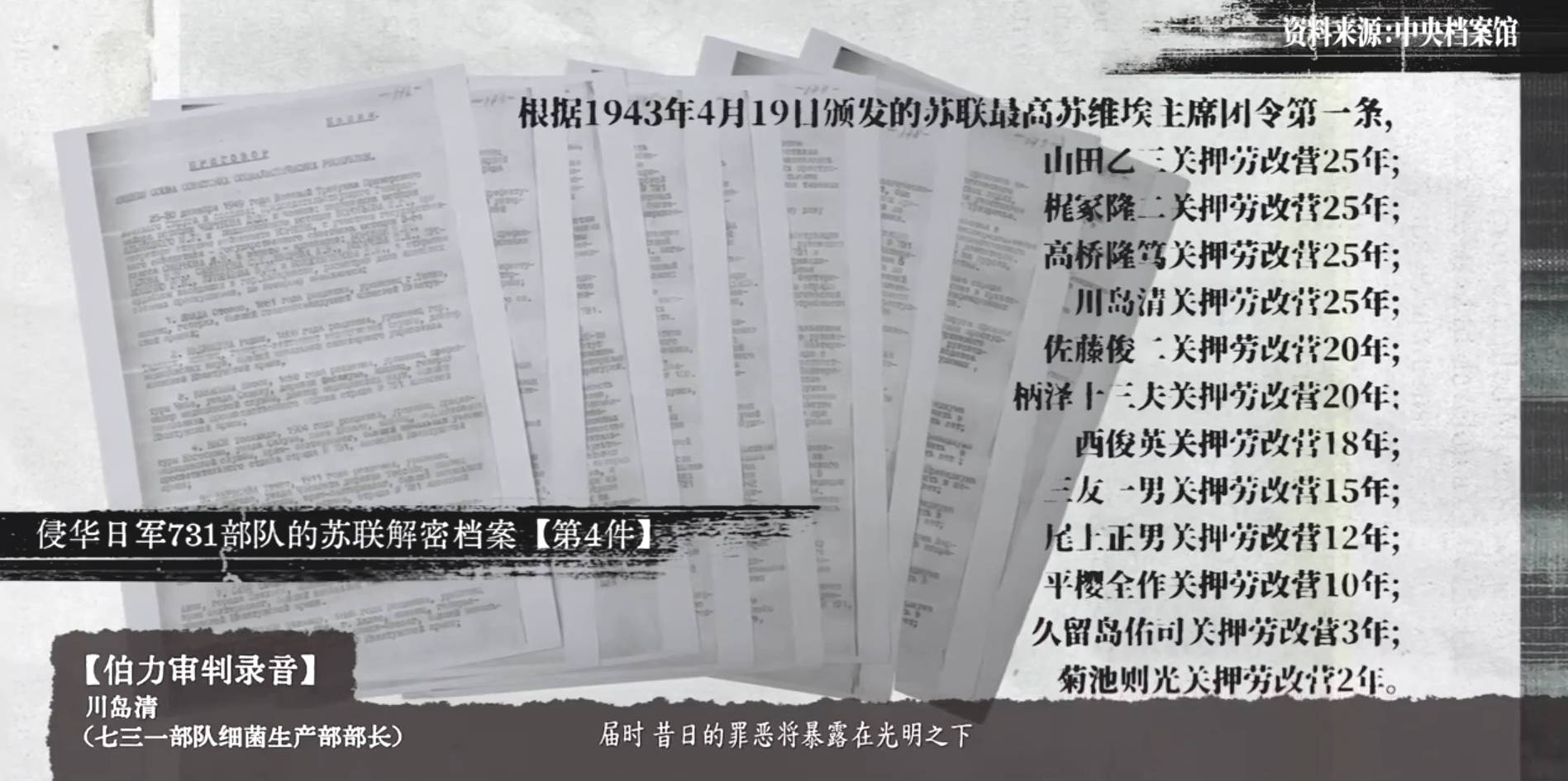 关东宪兵队不经审判,将抗日志士、平民秘密移交731部队用于人体实验,相关档案因日军战败仓促撤退未及销毁而留存,1997年由731罪证陈列馆工作人员金成民在黑龙江省档案馆发现并整理,近16万字的档案,字字都是侵略者的罪证。