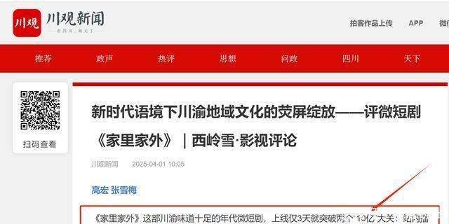 说到短剧《家里家外》,大家应该不陌生。这部短剧自2025年3月上线以来,迅速收获了大量好评。它通过简短的剧情展现了川渝婆娘那种泼辣性格背后的温情与善良。短短三天内,播放量就突破了10亿次,截止目前已经超过了25亿次,各大媒体也争相报道。这不仅让这部短剧本身取得了成功,还为川渝地区的旅游、文化和饮食带来了新的曝光,进一步提升了当地的知名度。