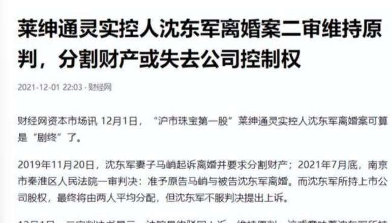 2022至2024年间,沈东军为了应对形势,不得不通过协议转让的方式,逐步出售自己所持的全部股份,最终套现约2亿元,彻底退出公司。 他的商业帝国轰然崩塌,那位曾经站在资本市场顶端的企业家,如今只留下了孤单与落寞。 尽管2亿元对于普通人而言是天文数字,但对于曾经拥有上市公司控股权的沈东军来说,这笔钱显得微不足道。 沈东军的结局,完全是他自己一手造成的,不能怪别人。如果他在关键时刻稍微心存感恩,记得妻子的感受,铭记马家曾经的帮助,或许今天的结局会截然不同,不至于以净身出户、被逐出豪门的方式收场。