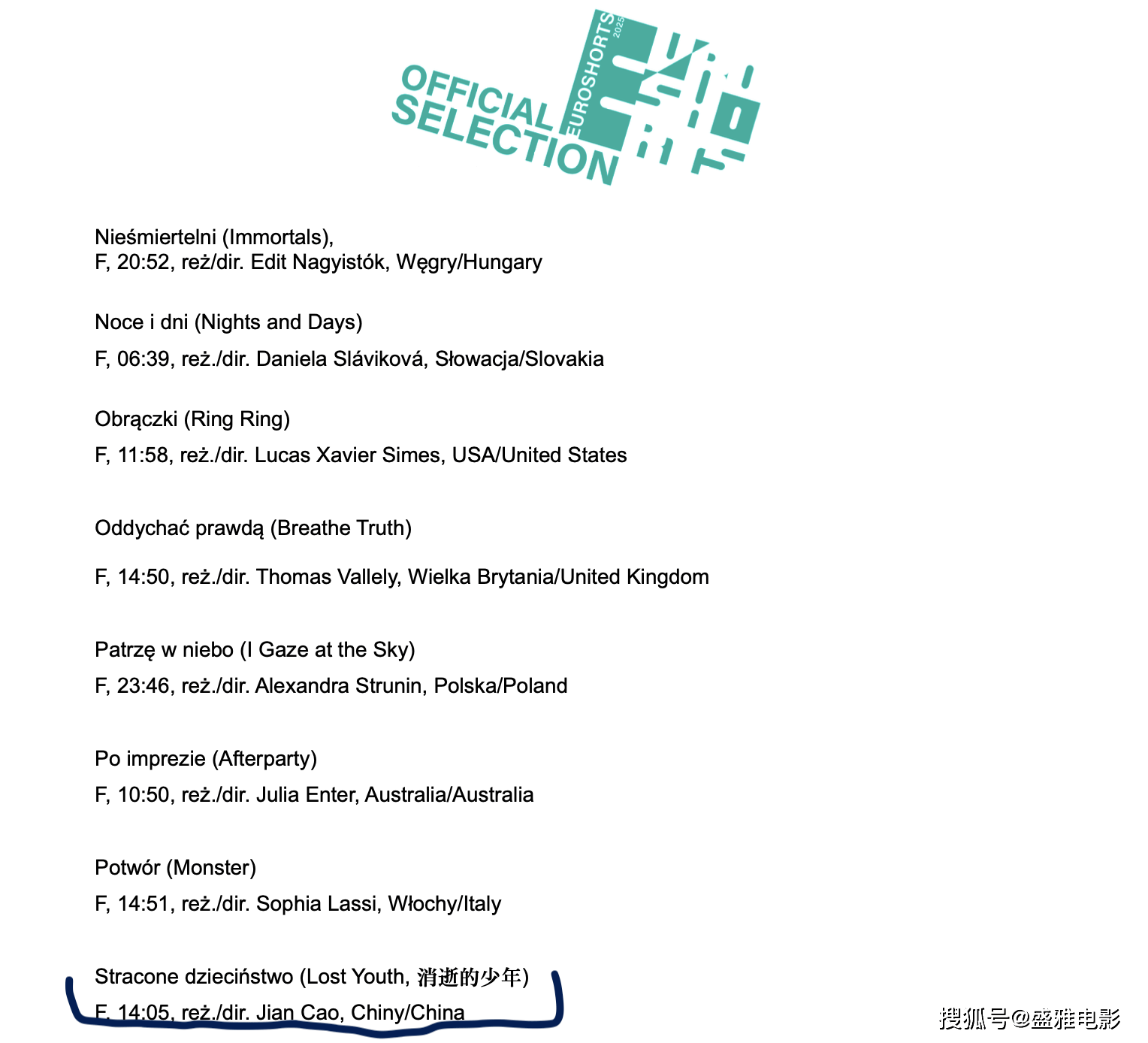 2025 年 European Short Film Festival EUROSHORTS(EUROSHORTS)国际竞赛单元名单近日公布。本届电影节共从全球投稿作品中遴选出 36 个国家的 75 部短片进入国际竞赛单元。由曹剑编剧并执导、北京盛雅文化传媒有限公司出品的现实主义短片《消逝的少年》(Lost Youth)成功入围。