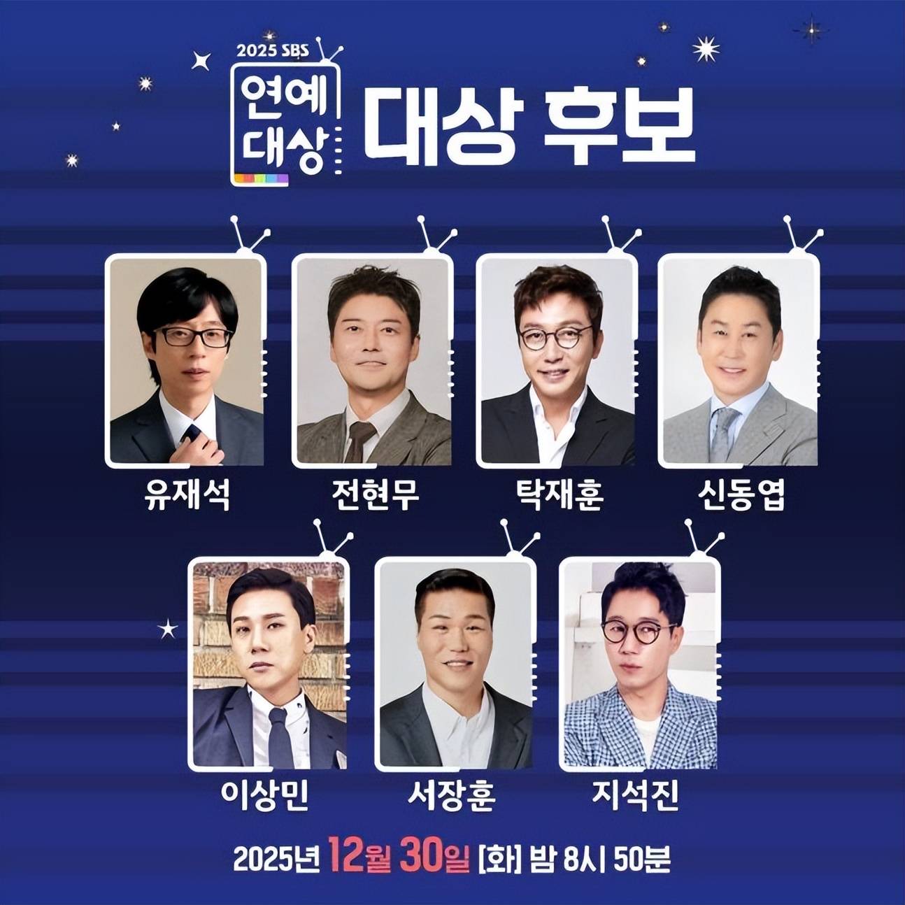 2025年SBS演艺大赏于30日晚上举办,今年的大赏提名为刘在石、全炫茂、卓在勋、申东烨、李尚敏、徐章勋、池石镇七人,大赏最终由李尚敏摘得。