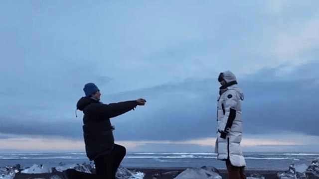 冰岛的钻石沙滩,冷冽、辽阔、透明的冰块散落在黑色沙地上。那一刻,孙丞潇单膝跪地,戒指💍在风中闪光,金莎向他走近,踮脚、拥抱、亲吻。这一幕很美,美得不真实,美得让人心里一紧。