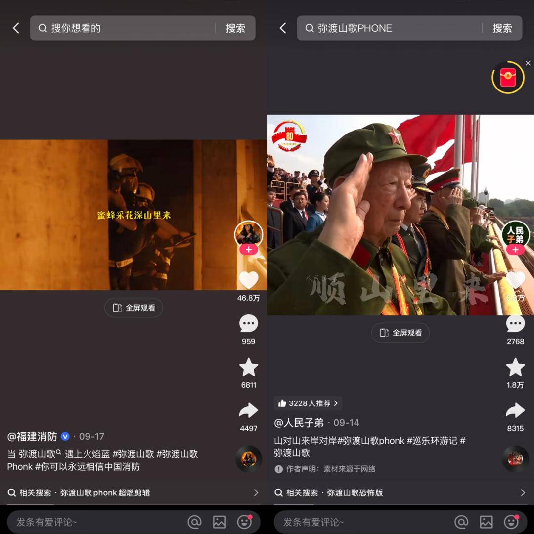 第一波在阅兵前后,宣发锚定在情绪节点。《弥渡山歌(PHONK)》的上线时间为9月8日,恰好落在“9·3阅兵”节点,尽管《弥渡山歌(PHONK)》本身并非主旋律歌曲,但传统民歌的基底让它与 “民族自信”、“家国情怀” 等主题具备强适配性。