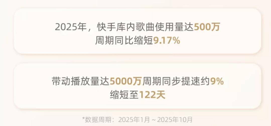 数据也证明,如今一首歌在快手从“被使用”到“成爆款”的周期政在大大缩短。《报告》显示,2025年,一首歌在快手平台的使用量达到500万、播放量达到5000万的发酵周期,平均缩短了约9%,缩短至122天。