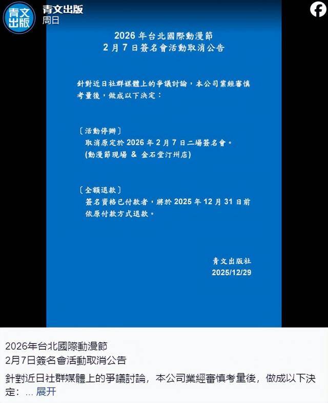 但网络风暴从来不讲“理解成本”,原定于 2 月 7 日在台湾举办的两场签名会,最终由 青文出版社于 12 月 29 日正式宣布取消。
