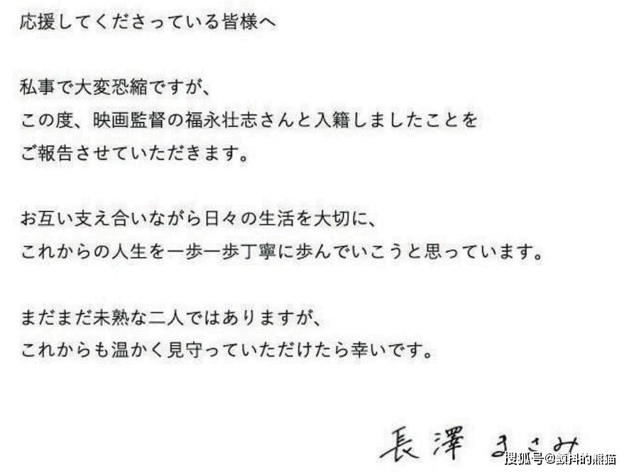 她在附有亲笔签名的文件中以“致一直支持我的各位”开篇,写道:“谨以私事叨扰各位,特此报告我已与电影导演福永壮志先生登记结婚。”