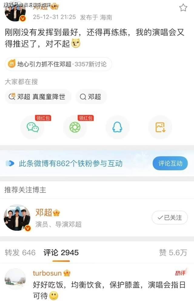 2025年12月31日跨年夜,海南海口五源河体育场的舞台上,『邓超』唱跳表演结束后,一条自认发挥不佳的微博引发热议。