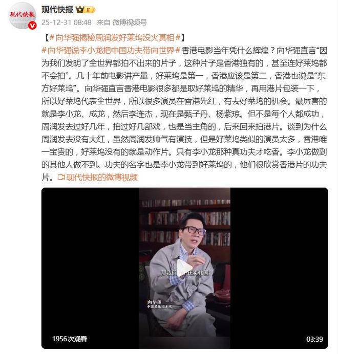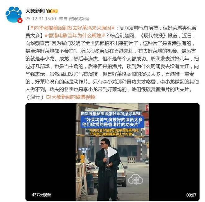 据12月31日的报道,香港影坛的知名人物『向华强』最近在一次访谈中透露了当年发哥『周润发』在好莱坞的遭遇,揭示了其未能像『成龙』、『李连杰』那样在好莱坞大放异彩的原因。『向华强』直言不讳地分析道,虽然『周润发』具备帅气的外表和出色的演技,但在好莱坞这样的大环境下,类似的演员实在太多。而香港电影独特的竞争力在于硬通货——真刀真枪的动作片,这正是好莱坞所没有的。